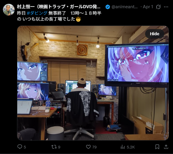 On April 1, the studio Anime Antenna Iinkai posted on its X account that the hentai’s dubbing had already been completed, along with an image of the project.